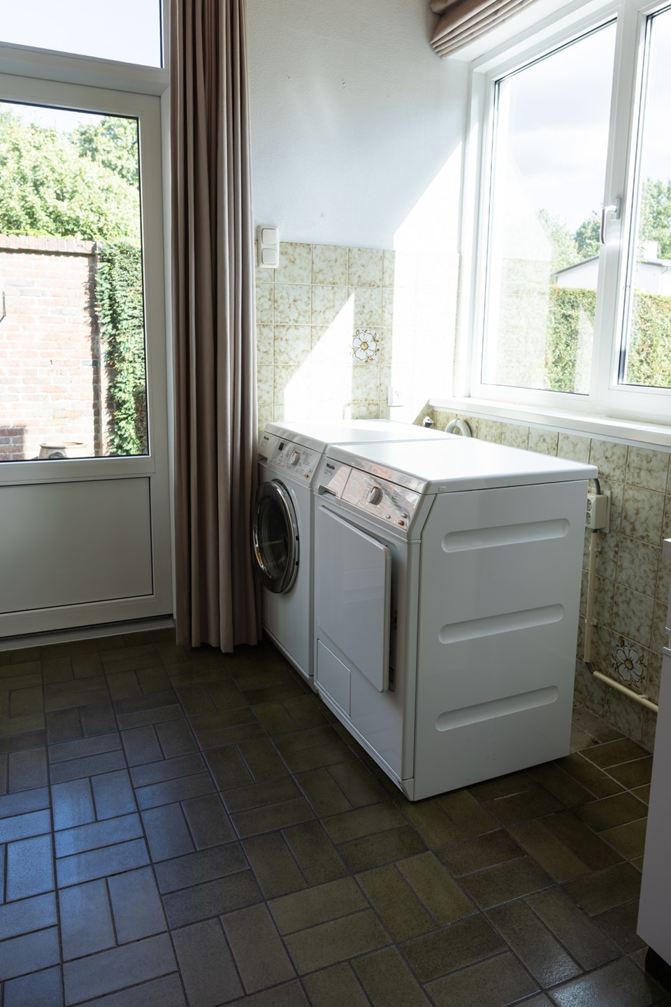 Aansluitend bevindt zich de bijkeuken met witgoedaansluitingen en doorgang naar de inpandige garage. Vanuit de bijkeuken bereikt u tevens de verzorgde tuin, waar u heerlijk kunt genieten van rust en privacy.