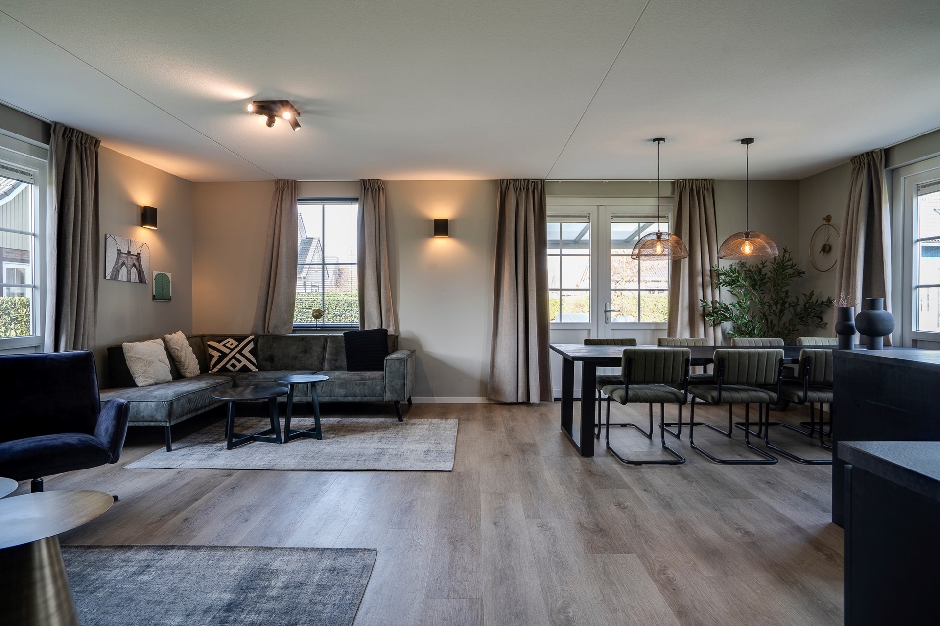 De royale woonkamer met open keuken vormt het hart van de woning. Dankzij de drie openslaande tuindeuren is er veel lichtinval en een directe verbinding met de tuin en terrassen.
