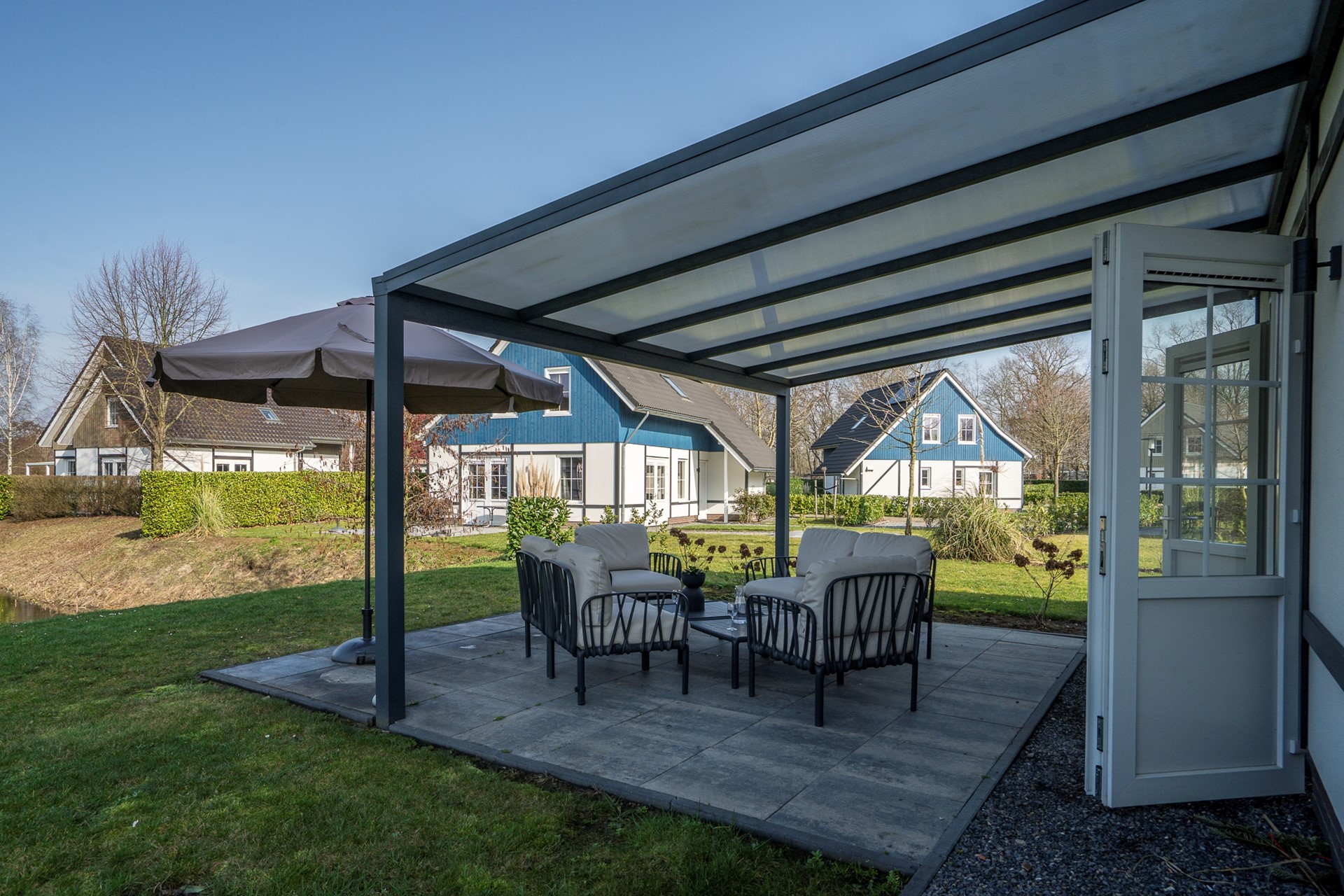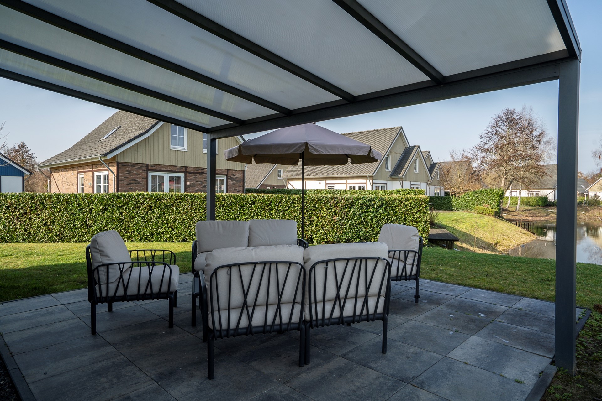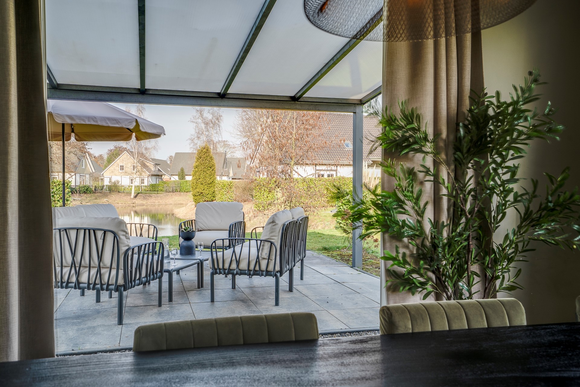 De tuin ligt rondom de woning en grenst aan een waterpartij, wat zorgt voor een rustige en sfeervolle omgeving. Er zijn meerdere ruime terrassen waarvan 1 met overkapping aanwezig die perfect gebruikt kunnen worden als loungegedeelte en eetgedeelte. Dankzij de ruime opzet is er voldoende plaats om met meerdere personen tegelijk te genieten van het buitenleven.