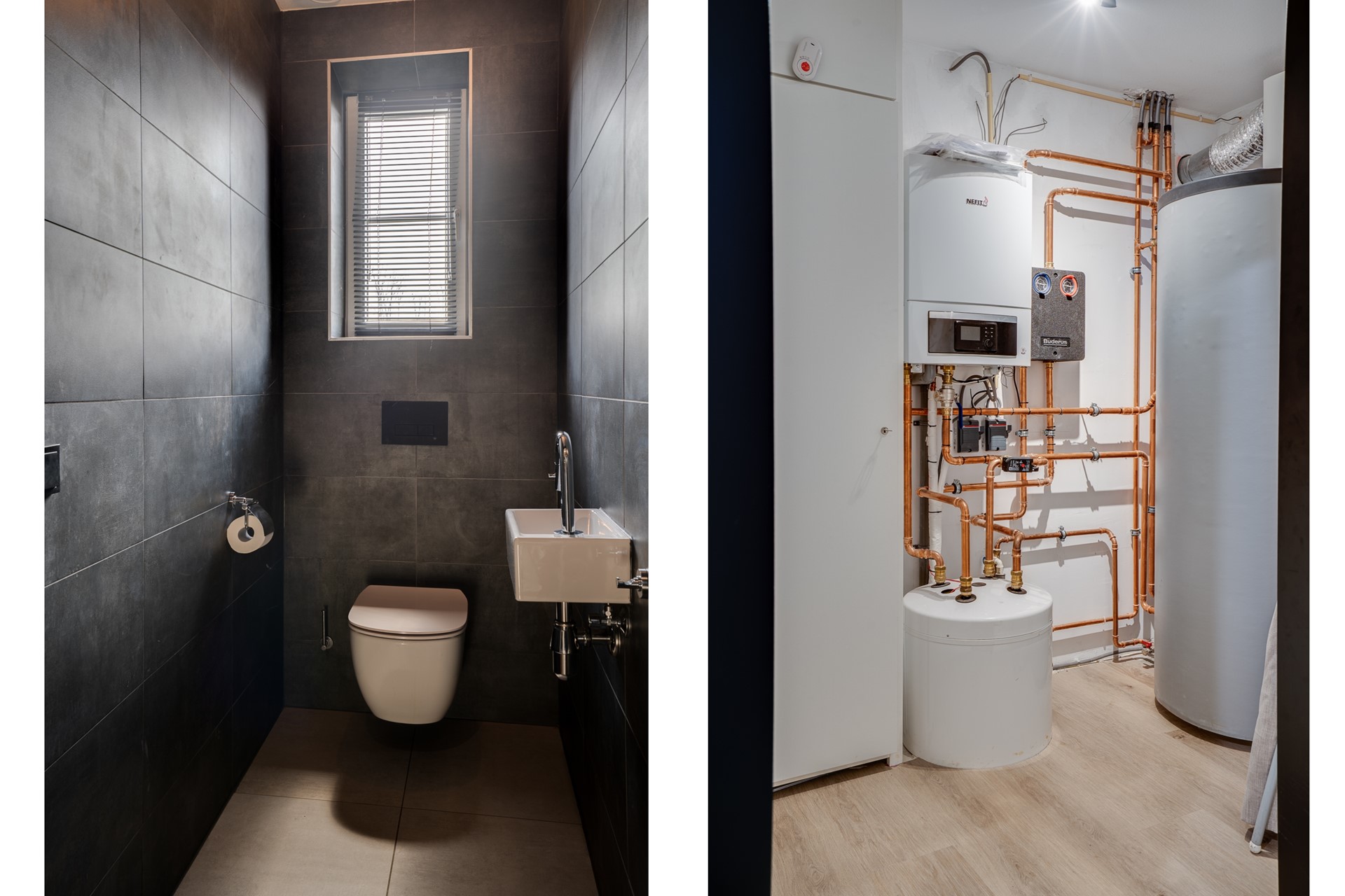 De moderne toiletruimte is voorzien van een zwevend toilet en fonteintje. Op de begane grond bevindt zich tevens een ruime 2-persoons slaapkamer met een luxe ensuite badkamer, uitgerust met een inloopdouche, wastafelmeubel en designradiator. Ideaal voor gelijkvloers gebruik of gasten.