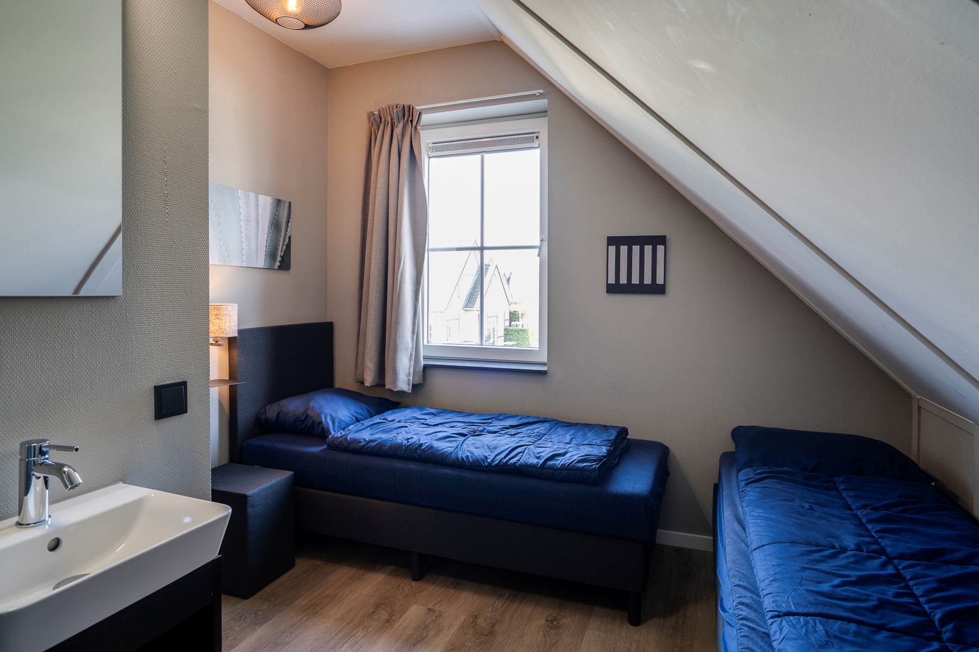 • Slaapkamer met twee eenpersoonsbedden en ensuite badkamer met inloopdouche en wastafelmeubel